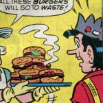Jughead’s sole interest is to devour hamburgers and maintain a sloppy hippy individuality; that is, the conforming non-conformist conforming to fashionable free thought. Archie, by contrast, is pure bourgeois, faking out blonde pony-tailed Betty while competing with Reggie for the attention of icy dark-haired vamp, Veronica. Archie is sparked by standard educational values, standard jargon— as all students are in Archie’s world. Education is based on imitation, though much of it jargon. True education should actually guide past the jargon.