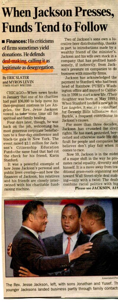 As culture war profiteers go, they often assume something of a gangster style. They also assume simultaneously, as Thomas Sowell is fond of pointing out, “the moral high ground.” From that high perch of “sensitivity,” their brand of morality is applied as a bludgeon. Under the shield of “moral authority” Reverend Jesse Jackson has enriched himself by these methods of pressure. This technique was even admitted by the liberal LA Times in a March 2001 headline: “When Jackson Presses, Funds Tend to Follow: His criticisms of firms sometimes yields donations. He defends deal-making, calling it as legitimate as desegregation.”