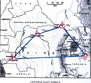 in Tanzania’s Serenghetti region. So the line from Maridi to the Serenghetti forms the third point C to form the far turn in the track. And finally we wind up in D— or Kinshasa, Zaire— where CDC members disembarked to began scoping the outbreak of Ebola.