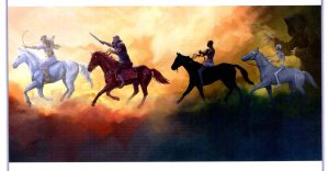 And they’re off with Skinny Pony in the lead. Numbers are going up by the minute for this pride of Dearth Stables, jockey Terry Tory riding hard. But Skinny Pony doesn’t keep the lead for long. The Break Neck War Horse, odds-on favorite of the Four Horsemen, is closing fast on the far turn. They’re going neck-and-neck on the back stretch, War and Dearth, but they finally have to give up the lead. At the far turn the entry from Hunger Farms is gaining. Then all three, Dearth and War running half a length behind Hungry Pony in a tight cluster around the turn.
