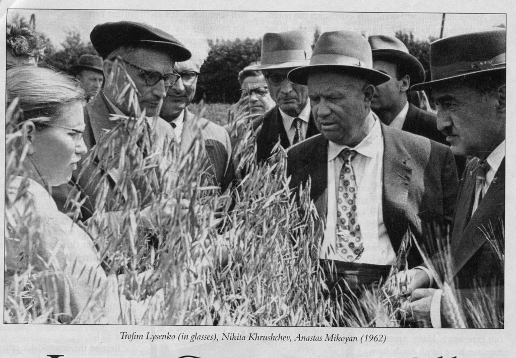 ☞ Nature vs. Nurture was the title fight. Plant replication is not genetic, stated Lysenko; they just need to weather environment. Therefore, following generations will adapt accordingly. They will have to toughen up— eh, comrade— like the people. Mendel’s genetic theory, positing heritable traits: so much bourgeois bull! (Which would be news to Watson and Crick who started mapping the genome universe.) To the reigning social shape-shifters, the idea of being able to nurture an organism by external conditions— virus or human— was held as solemn belief. Including social controls, environmental conditions are the supreme maker. (And don’t tell us your little boy doesn’t like dresses! He can be made to like them by nurturing his female side.)